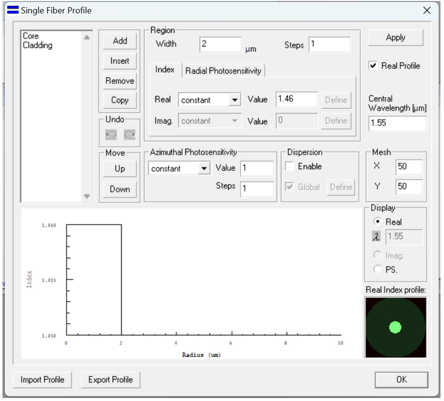 接下來,您將為單個(gè)光纖定義某些參數(shù)。在“Single Fiber”對話框中,您可以設(shè)置以下特性: Index Profile, Photosensitivity Profile, Number Of Points In Mesh, Central Wavelength等。