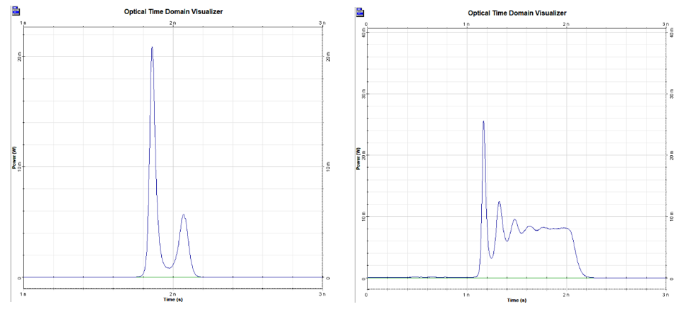 而在接下來的兩幅圖中,顯示了調(diào)制峰值功率電流I=50mA的生成光脈沖。在圖3左側(cè)的圖中,IB=10mA,低于默認(rèn)值Ith=33.46mA,在右側(cè)的圖中IB=Ith=10mA。在IB=10mA的情況下,當(dāng)我們?nèi)=Tsp時(shí),根據(jù)上述公式,td約為0.6ns。