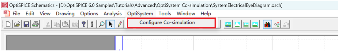 OptiSPICE原理圖可以設計為使用元件Electrical Input – Vsource、Electrical Input - Isource或Optical Input接受來自OptiSystem的電數(shù)據(jù)和/或光學數(shù)據(jù)。放置在OptiSPICE中的元件probes用于將數(shù)據(jù)從OptiSPICE傳輸?shù)絆ptiSystem。一旦OptiSPICE中的輸入和輸出被定義(ElecInput_V1和probes;參見圖1),原理圖需要配置為聯(lián)合模擬運行。這可以通過點擊“OptiSystem > Configure Co-simulation”來完成(參見圖2)