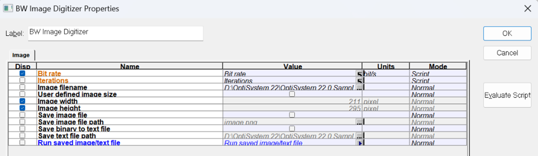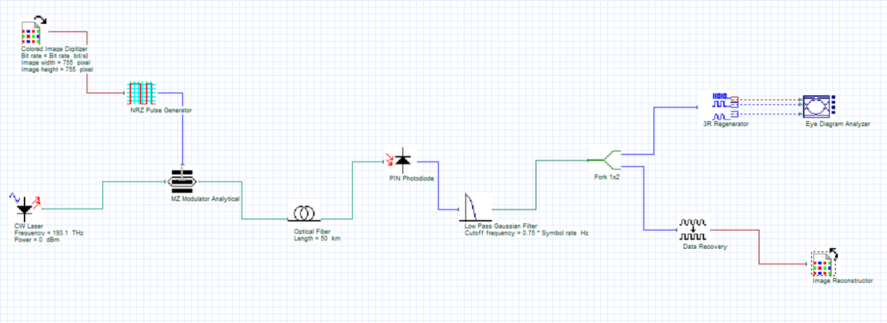 在這個鏈路中,我們將圖片導入到黑白圖像數(shù)字化組件(Black and White Image Digitizer),該組件將圖片轉(zhuǎn)化成二進制信號,生成的信號會調(diào)制載波經(jīng)過50km的光纖系統(tǒng)進行傳輸,光電轉(zhuǎn)化并濾波之后,我們用數(shù)據(jù)恢復器件(Data Recovery)來恢復二進制信號,再用圖像重構(gòu)組件(Image Reconstructor)接收二進制信號實現(xiàn)對傳輸之后圖像的恢復。