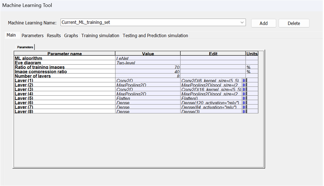 打開機器學習工具,在主參數(shù)選項卡上可以定義算法、神經(jīng)網(wǎng)絡的層數(shù)以及每層的類型,設置如圖3所示,圖中1000個眼圖的70%用于訓練,圖片壓縮率為40%。