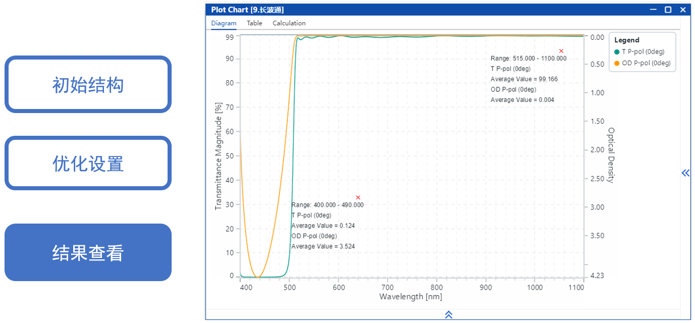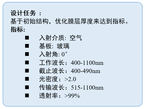 通過優(yōu)化初始結(jié)構(gòu)的厚度,目標(biāo)是在0°入射時(shí),400-490 nm截止,平均光密度>2。515-1100nm透過,平均透射率>99% 。
