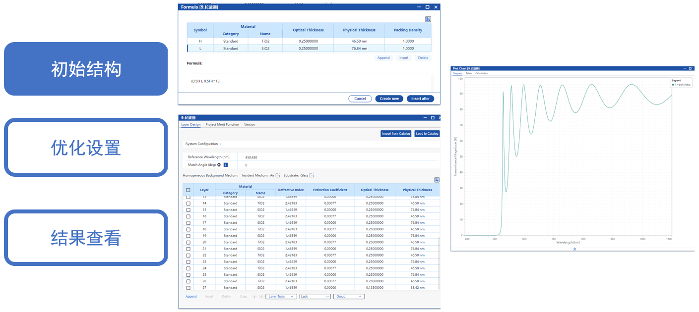 使用公式工具構(gòu)建了上述膜系作為基礎(chǔ)結(jié)構(gòu),右圖展示了其在400-1100 nm內(nèi)0°入射時(shí)的光譜?梢钥闯龃藭r(shí)在的透射波段有很多的波紋。