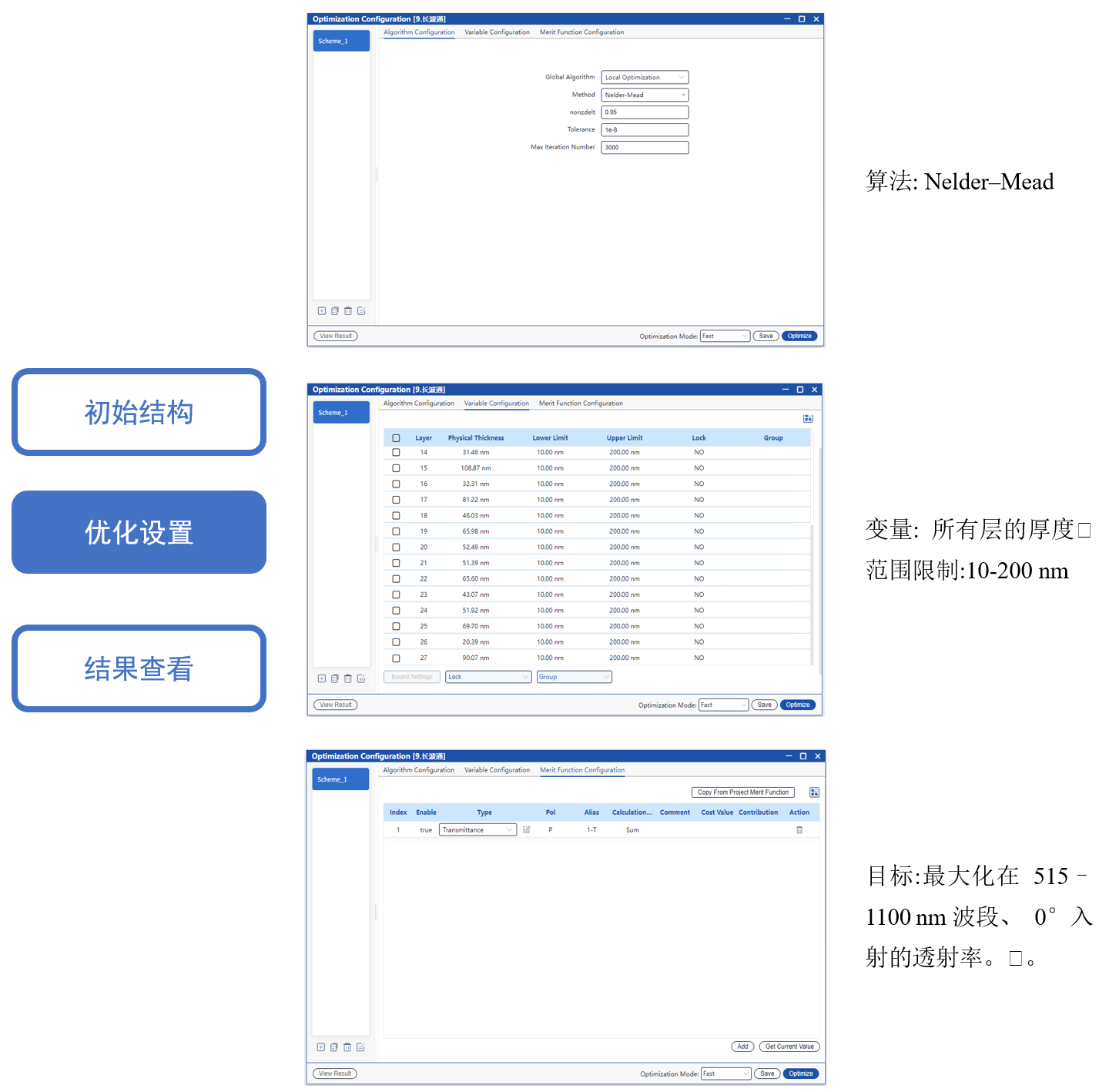 采用 Nelder-Mead 算法對各層厚度進(jìn)行優(yōu)化,目標(biāo)是在 400–1100 nm 波長范圍內(nèi)、0° 入射時(shí)最大化平均透射率。