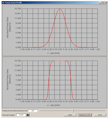 在對(duì)話框中可以選擇超高斯函數(shù)近似泵浦光的分布。超高斯函數(shù)是指光的分布具有高斯分布的數(shù)學(xué)形式,但其指數(shù)比2大。增加超高斯函數(shù)的指數(shù)可以形成平頂分布。關(guān)于這些內(nèi)容的詳細(xì)描述請(qǐng)參閱LASCAD手冊(cè)中。