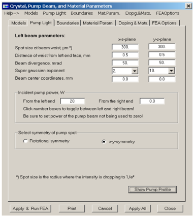 在“Incident pump power, W”標(biāo)簽的對(duì)話框中可以分別定義晶體左右端面的泵浦功率。對(duì)端泵而言,通常泵浦光束聚焦到棒中。在"Spot size at beam waist", "Distance of waist from left end face" 和"Beam divergence"的對(duì)話框中可以定義相關(guān)量的大小。