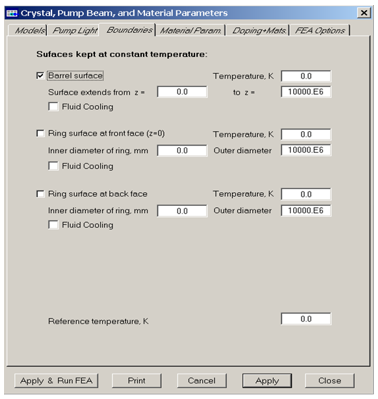 單擊LASCAD 主窗口中的“FEA/Parameter Input & Start of FEA Code”打開標(biāo)題為“Crystal, Pump Beam and Materials Parameters”的窗口,如圖2。注意有六個(gè)標(biāo)簽頁來定義不同的參數(shù)組。