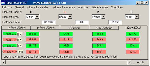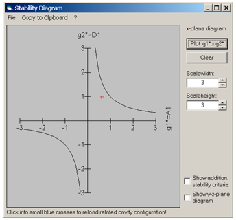 單擊“Plot”按鈕就可以顯示確切的諧振腔結(jié)構(gòu)的穩(wěn)定性。圖形中紅色的十字形符號(hào)所在的位置表示腔的穩(wěn)定性。改變諸如反射鏡曲率半徑這樣的腔參數(shù)以后,再單擊“Plot”按鈕,將出現(xiàn)第二個(gè)十字形符號(hào),它的位置表明了腔參數(shù)改變對(duì)腔穩(wěn)定性的影響。重復(fù)前面的操作,可以畫出一系列的十字形符號(hào),最后畫的這個(gè)總是紅色而以前的變成了藍(lán)色。腔的穩(wěn)定性對(duì)泵浦功率的依賴關(guān)系是非常重要的,因此為了分析這種關(guān)系像在第3節(jié)中描述的那樣對(duì)泵浦功率進(jìn)行調(diào)整。