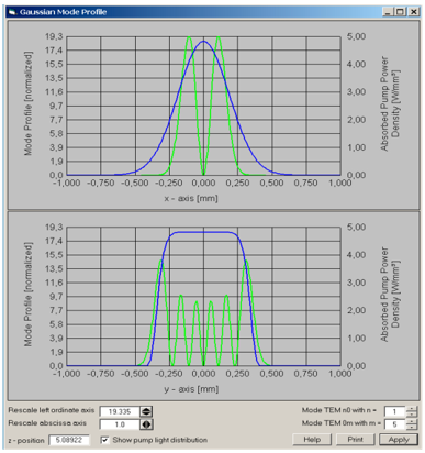 選定“Multimode Operation”按鈕可以畫出多模工作時(shí)的輸出功率。對(duì)這種情況,模的形狀是幾個(gè)橫模的疊加,它近似于一個(gè)平頂高斯光束,改變最高階橫模的階數(shù)可以改變平頂光束的寬度。當(dāng)這樣調(diào)整時(shí),最高階模寬度沿腔軸的變化也考慮進(jìn)去了。