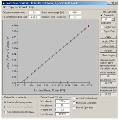 作為入射泵浦功率的一個(gè)函數(shù),輸出激光功率可以通過按下“Plot”按鈕開始計(jì)算。按下“Adjust Range”按鈕可以調(diào)整繪出曲線和坐標(biāo)軸限制相適應(yīng)。為了計(jì)算此圖,對(duì)熱透鏡效應(yīng)作了線性調(diào)整,第3節(jié)的“Modifying cavity parameters”有對(duì)這個(gè)問題的相關(guān)描述。計(jì)算的點(diǎn)數(shù)可以通過窗口右上角的上下箭頭來(lái)改變。
