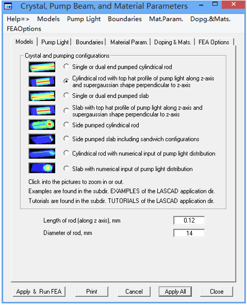 選擇主菜單“FEA-Parameter Input & FEA code”,打開(kāi)“Crystal ,Pump Beam and Material Parameters ”窗口,該窗口有6個(gè)標(biāo)簽。“Models”標(biāo)簽顯示了LASCAD提供的預(yù)定義模式,如圖1所示。在這個(gè)教程中,模式Cylindrical rod with top hat 已經(jīng)被勾選,該模式表示吸收泵浦光強(qiáng)分布在熱透鏡軸方向?yàn)榻破巾敚ㄒ卜Q為常數(shù))分布。