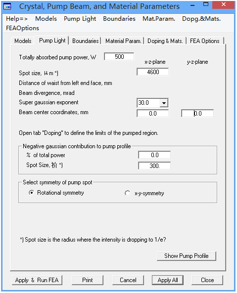 選擇’Pump Light’標(biāo)簽,如圖2所示,該標(biāo)簽用于定義泵浦功率密度。在這個(gè)模式下,我們必須事先知道總的吸收泵浦功率。總的吸收功率為500W。垂直于薄片軸的泵浦功率用超高斯函數(shù)定義,如help=>Pump Light-Top Hat Pump Light Distribution in Axis Direction。光斑的大小等于分布半徑。超高斯指數(shù)增大到一定程度后,截面分布接近平頂分布。可以點(diǎn)擊“Show Pump Profile”來(lái)查看截面圖。我們甚至可以從這個(gè)截面圖中減去一定百分比被吸收的泵浦光功率。