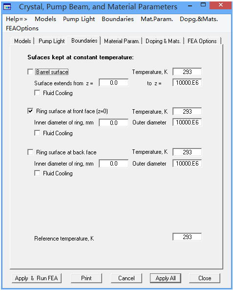 如圖所示,選擇“Boundaries”來(lái)定義邊界條件。假設(shè)在(z=0)處的晶體面與固體接觸時(shí)為常溫,當(dāng)然我們也可以勾選流體冷卻。假設(shè)固體溫度為293K。在3能級(jí)系統(tǒng)中,我們一般都采用開(kāi)氏溫度。參考溫度是用來(lái)計(jì)算晶體熱畸變,對(duì)應(yīng)于晶體的初始溫度。