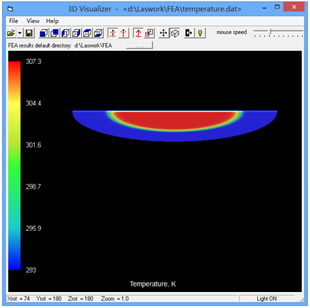FEA計(jì)算完成之后,點(diǎn)擊LASCAD 主菜單中“FEA-3D Visualizer” ,顯示熱負(fù)載分布,溫度分布,變形和壓力結(jié)果。圖5顯示了未冷卻處理的腔端面處的溫度分布。