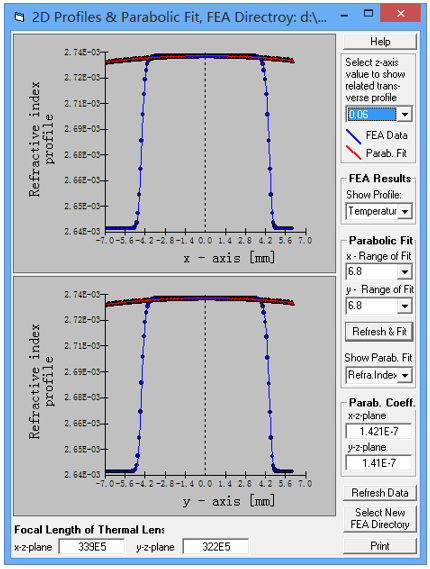 在LASCAD主菜單中點選“FEA-2D Data Profiles”,打開2D Profiles & Parabolic Fit ,顯示FEA結果的二維曲線。默認條件下顯示的是溫度分布。點選窗口右上角的下拉框,可以選擇晶體z軸方向不同位置處的二維曲線,該曲線與FEA離散點有關。同時,可以沿著z軸方向滾動鼠標,查看曲線特性。