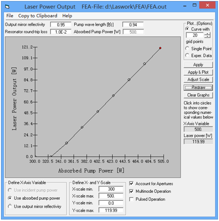 選擇性地,你可以選擇“Plot curve with ……grid points” ,采用預定義的20個網格點。這個計算會耗一定時間。后一個案例中,在定義X方向和Y方向的最小和最大的吸收泵浦功率分別為300W和500W。這個計算*臨界值和斜度效率,如圖8所示。