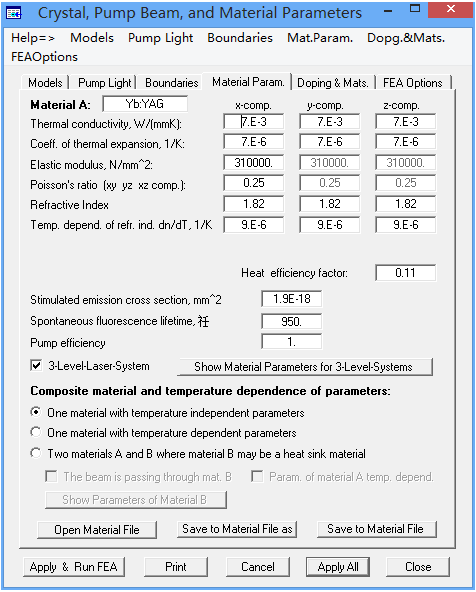 在“Crystal, Pump Beam, and Material Parameters”窗口中打開“Material Parameters”標簽,可以顯示Yb:YAG材料的參數(shù),如圖10所示。在圖10中已勾選“3-level-laser-system”?梢渣c選旁邊的“show material parameters for 3-level-systems”查看能級系統(tǒng)參數(shù),如能級數(shù),再吸收有效十字區(qū)域。