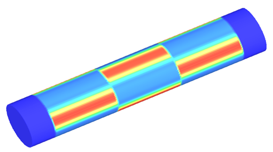 如果二極管組的放置是有一定偏轉角度的,如圖4所示是沿著棒放置三組二極管的結構的泵浦光分布,在“Length of diode bars”中輸入二極管的物理長度,“Number of diode groups along rod axis”中輸入二極管組的數目。在圖4中,每一組二極管由三個二極管條組成,并對稱的安排在棒的周圍。偏轉角為60°?偟膩碚f,如果棒周圍的一組二極管數目為n,那么偏轉角就是360°/2n。