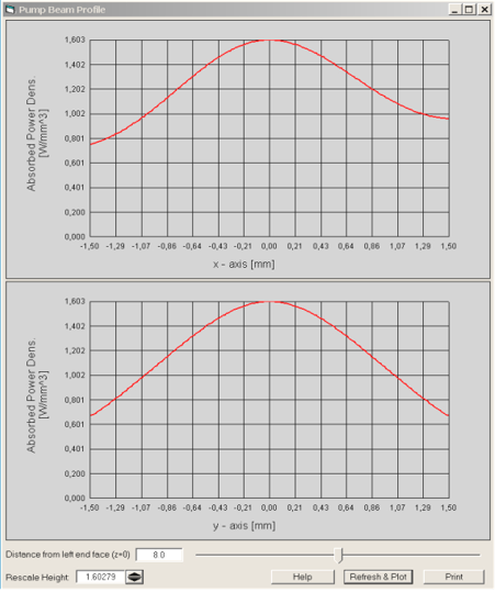 這個條目是不言自明的,吸收系數用來描述泵浦光束的指數衰減,依照公式 計算,這是由于泵浦光子的吸收所引起的,由晶體的摻雜水平所決定,詳細描述見手冊附錄。