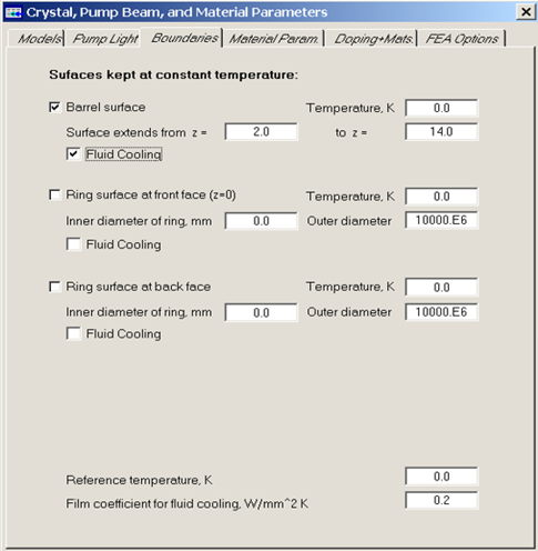 冷卻液不一定要延伸到管道的整個長度,因為有些地方沒有用來側面泵浦。填入“Surface extends from z=…”這一行的條目可以用來定義冷卻表面準確的起點和終點。如圖7所示的情況,冷卻表面是從z=2mm開始,到z=14mm結束的,而總長16mm的棒的兩端都沒有冷卻。坐標系的原點位于棒左端表面的中心。