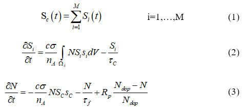 動(dòng)態(tài)多模分析的目的是進(jìn)行激光多模和激光調(diào)Q運(yùn)轉(zhuǎn)分析。激光腔內(nèi)橫模結(jié)構(gòu)近似為HG和LG模式。HG和LG模式是不同本征頻率對(duì)應(yīng)的正交特征函數(shù),我們假設(shè)模式之間的橫模振蕩互不干擾,因此模式之間的短時(shí)干涉影響可以忽略;谶@個(gè)假設(shè),起振模式中的反轉(zhuǎn)粒子數(shù)密度和光子數(shù)是由下面的以時(shí)間為變量的3D速率方程描述: