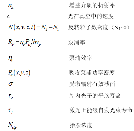 方程2-3用于四能級(jí)激光系統(tǒng)。準(zhǔn)三能級(jí)系統(tǒng)的多模分析還在研究中。三能級(jí)(泵浦能級(jí))和能級(jí)2(激光上能級(jí))之間,能級(jí)1(激光下能級(jí))和能級(jí)(基態(tài)能級(jí))之間的快速衰減速率已被假定。