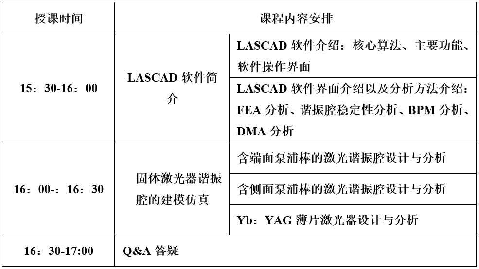 本課程重點突出LASCAD軟件的基本應用模塊、軟件操作及開發(fā)工具。利用LASCAD在固體激光器熱效應分析方面的全面功能,展示軟件FEA算法介紹、諧振腔穩(wěn)定性分析、BPM分析、DMA分析。