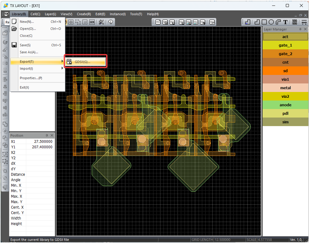 TX系列的布局編輯器TX Layout軟件可以支持GDSⅡ文件的導(dǎo)入和導(dǎo)出,其功能如下: