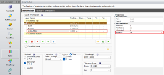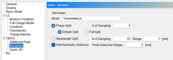 設置Berreman路徑下的模式,其中每個選項的具體含義可以查閱軟件用戶手冊,或查閱訊技光電的書籍《TechWiz LCD 3D中文手冊》