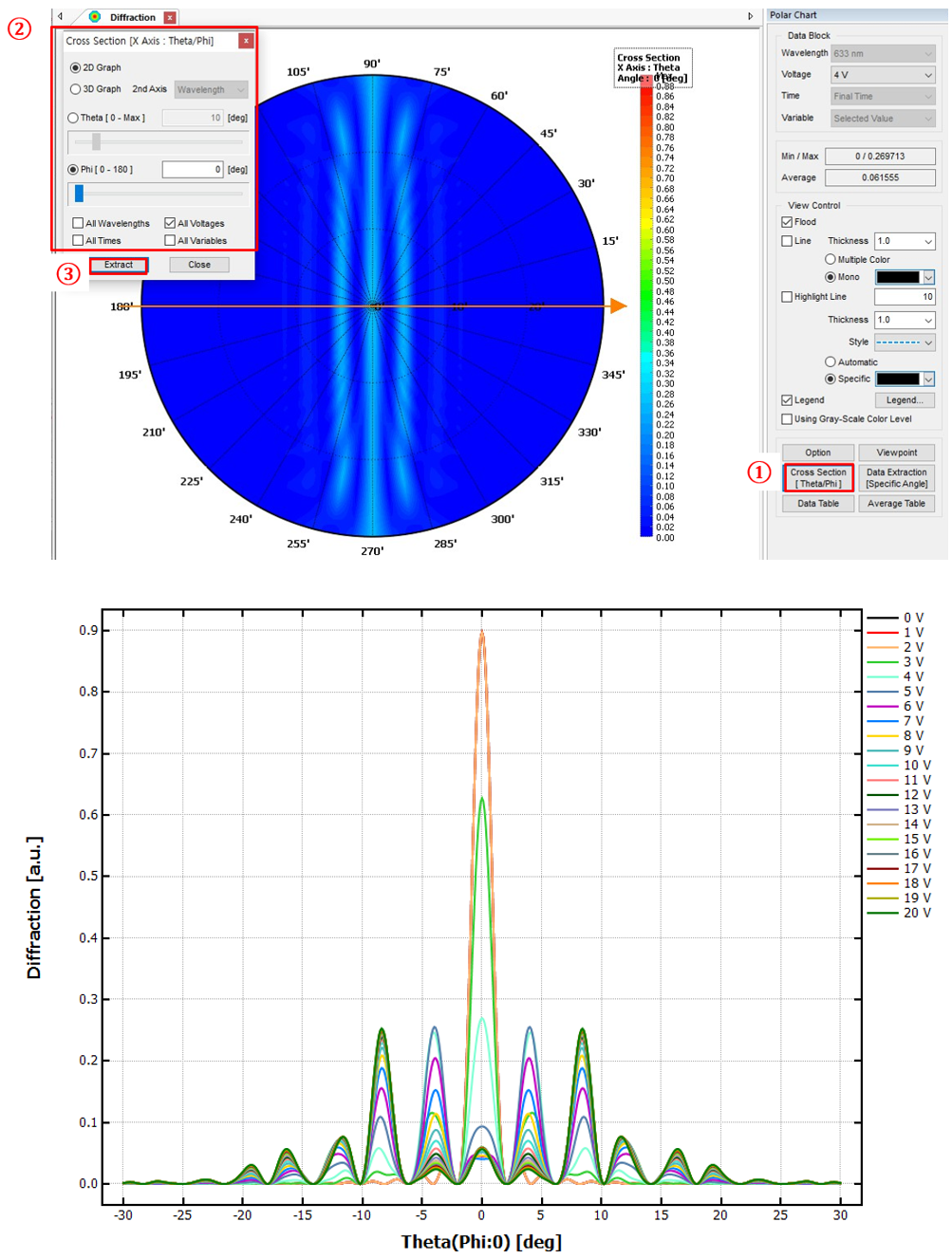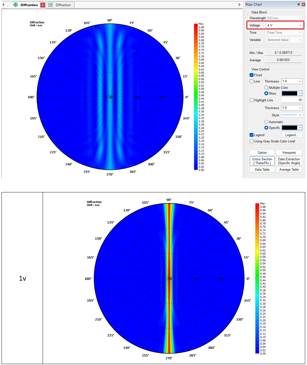 在衍射分析模式下,使用遠場方程計算衍射光。強度是根據(jù)穿過材料的輸出光的E場之和計算得出的