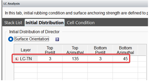 液晶的初始分布,表面方向設(shè)置