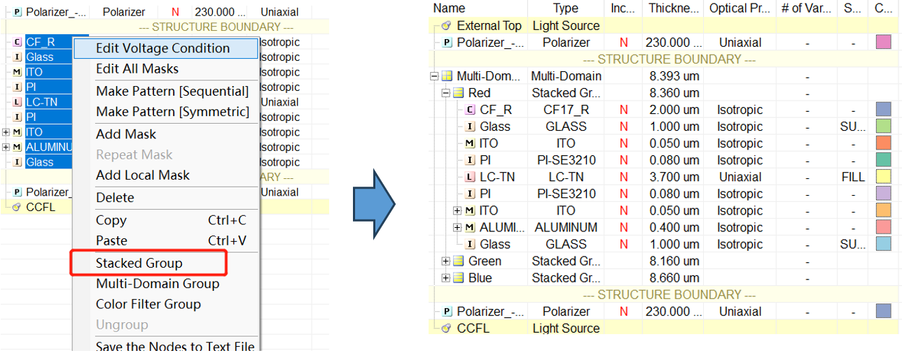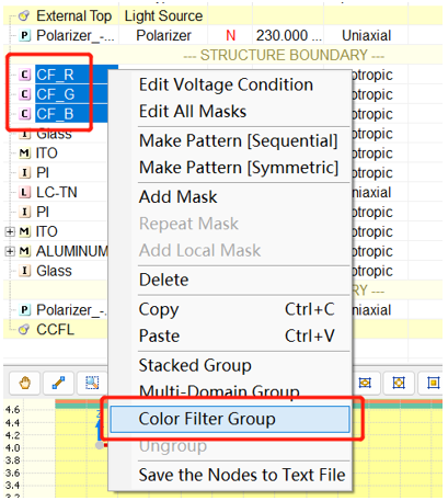 TechWiz LCD 2D可以分析液晶盒的顏色和彩膜(Color-Filter,CF)的特性。對(duì)于RGB三組結(jié)構(gòu)相同的彩膜結(jié)構(gòu),可以使用CF層組來(lái)搭建,對(duì)于RGB三組結(jié)構(gòu)不同的彩膜結(jié)構(gòu),可以使用單層+多疇層組的方式來(lái)進(jìn)行仿真。