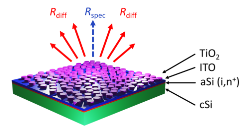 本工作中所考慮的太陽能電池結(jié)構(gòu)示意圖。Rdiff和Rspec表示漫反射和鏡面反射部分。該圓盤是在異質(zhì)結(jié)技術(shù)(HJT)后發(fā)射極太陽能電池上沉積的,其表面是用非晶硅(aSi)固有層和n+摻雜層鈍化的未拋光的平面硅片ITO薄膜既是減反射涂層(ARC),也是正面觸點。