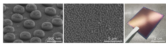 (左圖,中間圖)不同放大倍數(shù)的太陽能電池頂部圓盤的電子顯微圖。左邊的圖突出了單個圓盤的特性,而中間的SEM圖突出了樣本的一致性。(右圖)39 × 39 mm涂層太陽能電池的照片。