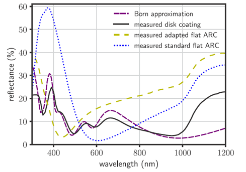 通過Born近似計算的圓盤圖案的反射率和單個圓盤的有限元模擬(本文討論的數(shù)值模擬是基于有限元方法(FEM)的軟件JCMsuite)。測量圓盤涂層樣品和調(diào)整平板的反射率ARC (50 nm厚度的ITO)的圓盤結(jié)構(gòu)。一個標準的平面ARC參考(80 nm厚度的ITO)作為比較。