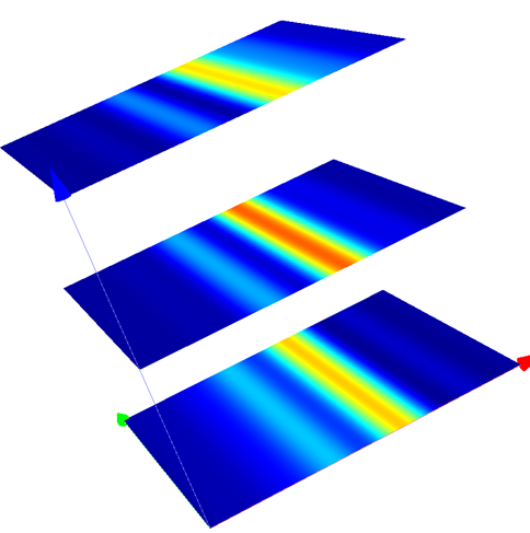 輸出文件fourier_transform_image.jcm包含經(jīng)過光學(xué)系統(tǒng)后的場的傅里葉變換。可以使用笛卡爾輸出后處理來計(jì)算相干圖像。下圖顯示了不同z方向切片的圖像(圖像平面沿z方向放置),用于S偏振照明。