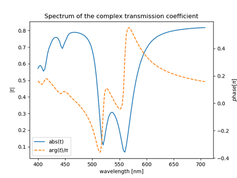下圖描繪了透射系數(shù)的幅值和相位(由于對(duì)稱性,這與偏振性無關(guān)):