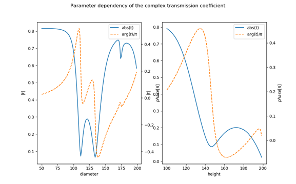 納米片半徑和高度的變化會(huì)影響相位和透射率。這個(gè)光譜特性使用腳本data_analysis/run_scan_geometry.py來研究。在這里,納米片的直徑和高度發(fā)生了變化,并記錄了相位和透射的變化。