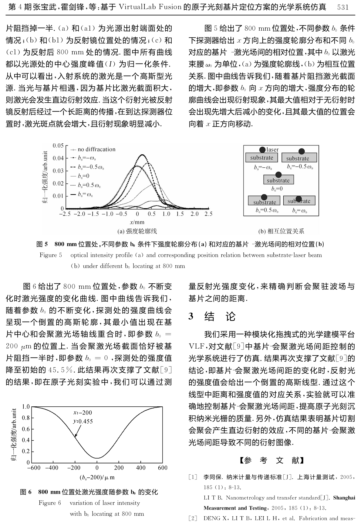 摘要:為了探究原子光刻中基片與會(huì)聚激光場(chǎng)間距對(duì)沉積納米光柵質(zhì)量的影響,我們基于VirtualLab Fusion平臺(tái)實(shí)現(xiàn)了基片定位控制方案中光學(xué)系統(tǒng)的建模和仿真。結(jié)果顯示:基片在切割會(huì)聚激光時(shí)將產(chǎn)生直邊衍射圖像,其輪廓形狀和最大值都會(huì)隨著基片切割激光截面區(qū)域大小的變化而變化:虛擬光電探測(cè)器上所得到的反射光強(qiáng)度值將隨著基片-會(huì)聚激光間距的變化給出了倒置的高斯線型,其最低點(diǎn)出現(xiàn)在基片中心和會(huì)聚激光場(chǎng)軸線重合時(shí)的位置上。當(dāng)會(huì)聚激光場(chǎng)截面恰好被基片阻擋一半時(shí),探測(cè)處的強(qiáng)度值降至45.5%。這種光強(qiáng)隨基片位置的變化情況為精確地定位基片位置提供了理論支撐。