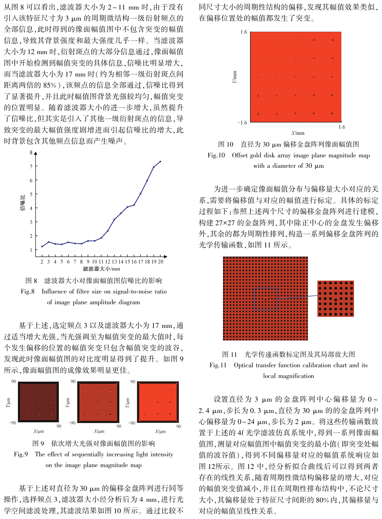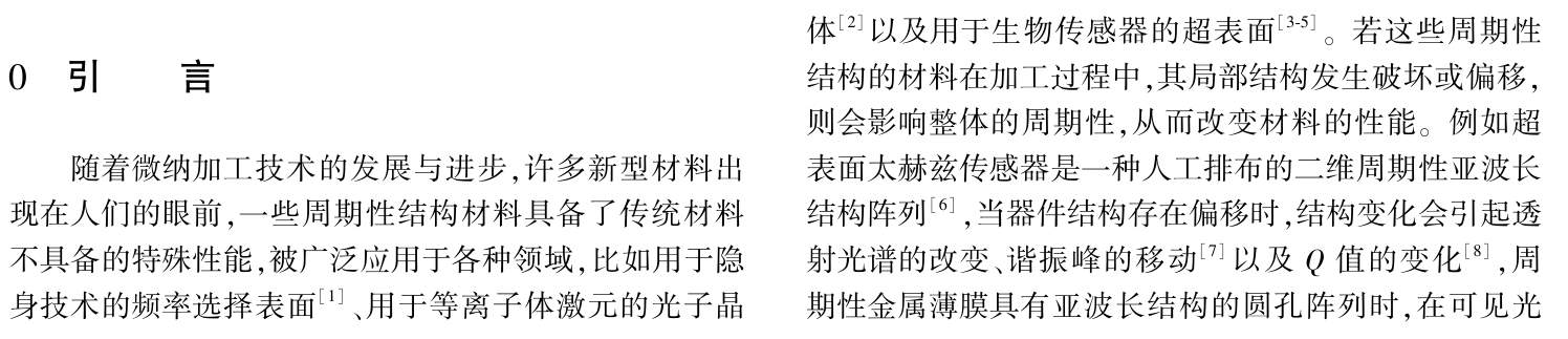 摘要:為了快速、直觀地檢測出周期性結(jié)構(gòu)的微小偏移,提出了基于4f光學(xué)系統(tǒng)的周期性結(jié)構(gòu)微小偏移檢測方法。 首先使用VirtualLab Fusion 光學(xué)仿真軟件進行理論研究,建立預(yù)設(shè)偏移的周期性微結(jié)構(gòu)模型,構(gòu)造了光學(xué)傳遞函數(shù),利用4f空間濾波方法,獲得與周期性微結(jié)構(gòu)對應(yīng)的像面幅值圖。 經(jīng)分析得出在透明基底的周期性結(jié)構(gòu)中,不論尺寸大小,若偏移量在相鄰特征尺寸間距的80%范圍內(nèi),經(jīng)擬合后幅值變化與微結(jié)構(gòu)偏移量呈線性關(guān)系,且幅值變化位置與微結(jié)構(gòu)偏移位置一致。 依據(jù)仿真的光學(xué)系統(tǒng)參數(shù)搭建了實驗系統(tǒng),實驗結(jié)果與仿真一致,并且該套系統(tǒng)可以實現(xiàn)3.4mm×2.6mm的測量視場,分辨率能達(dá)5 μm,能夠?qū)崟r快速地對周期性結(jié)構(gòu)材料進行位移或缺陷檢測。