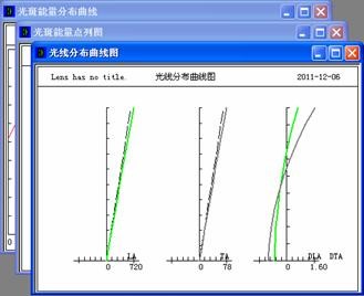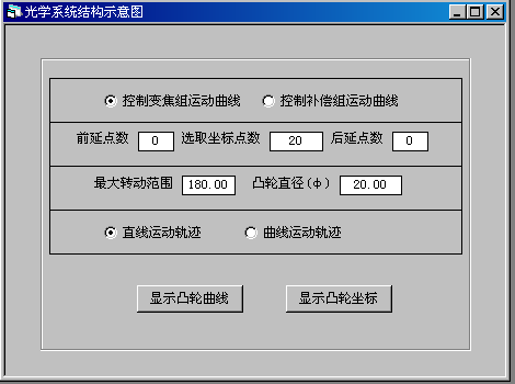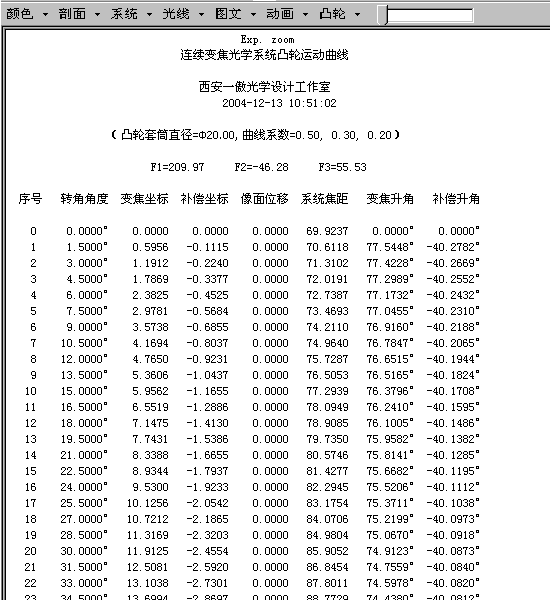 在顯示可變焦距光學(xué)系統(tǒng)示意圖的同時(shí),還可自動(dòng)計(jì)算并顯示連續(xù)變焦光學(xué)系統(tǒng)凸輪曲線。對(duì)三組元連續(xù)變焦系統(tǒng),還可根據(jù)需要計(jì)算任意點(diǎn)數(shù)的凸輪曲線以及曲線的坐標(biāo)值等。對(duì)非三組元連續(xù)變焦系統(tǒng),還可根據(jù)系統(tǒng)給出的可變間隔數(shù)據(jù)計(jì)算指定點(diǎn)數(shù)的凸輪曲線以及曲線的坐標(biāo)值。