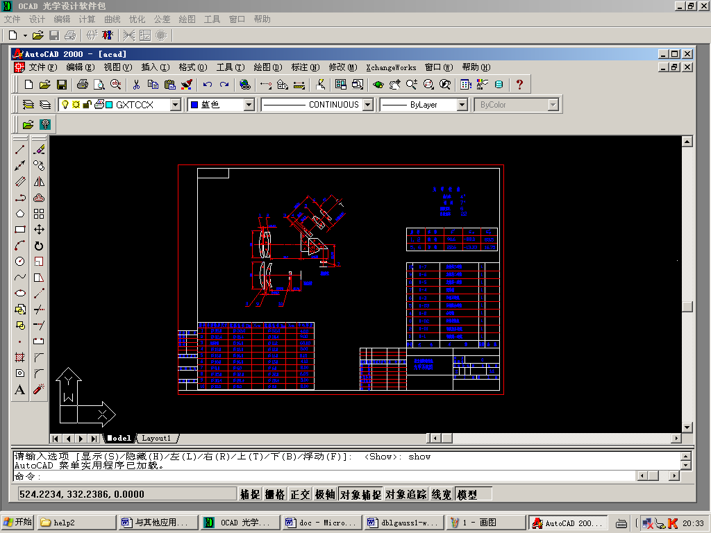 本軟件包具有可與其他應(yīng)用軟件鏈接使用的功能。由于光學(xué)設(shè)計(jì)軟件不僅只進(jìn)行光學(xué)設(shè)計(jì),還要進(jìn)行設(shè)計(jì)結(jié)果的輸出工作,其中包括計(jì)算數(shù)據(jù)的輸出和設(shè)計(jì)圖紙的繪制輸出工作。輸出設(shè)計(jì)數(shù)據(jù)往往需要經(jīng)常使用的 Microsoft Word 軟件及Microsoft Excel 軟件等,設(shè)計(jì)圖紙的繪制除本軟件可以直接繪制各類光學(xué)圖紙外,有時(shí)也許要應(yīng)用工程通用的 AutoCAD 應(yīng)用軟件以及 Solid Work 軟件等。為了便于使用這些有用的應(yīng)用軟件,本軟件包可以把這些好軟件鏈接在一起,操作十分方便。圖8到圖10分別為本軟件包直接調(diào)用被鏈接的Microsoft Word 軟件、Microsoft Excel 軟件以及 AutoCAD 軟件的屏幕界面。