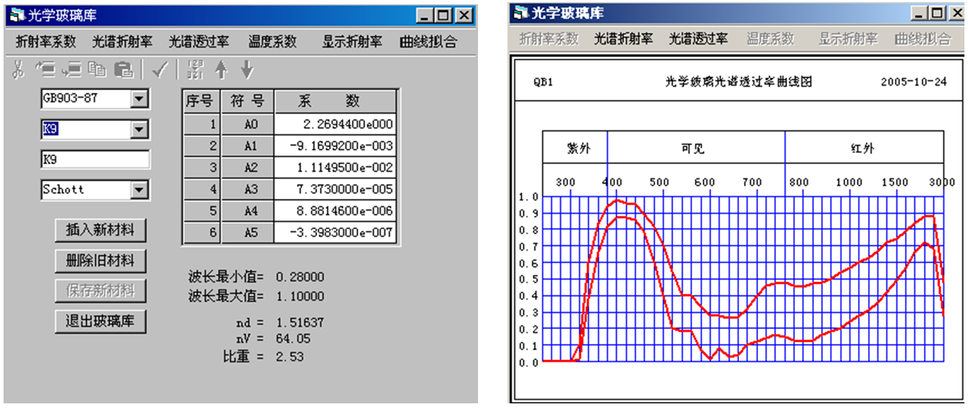 其中玻璃材料數(shù)據(jù)庫幾乎涵蓋了國內(nèi)外如CODE Ⅴ、Zemax、OSLO 以及 SOD88 等光學(xué)軟件具有的所有光學(xué)材料玻璃庫,其中還包括有色玻璃材料,所有玻璃庫用戶都有對(duì)其補(bǔ)充修改的功能,便于不斷擴(kuò)充如圖12所示。