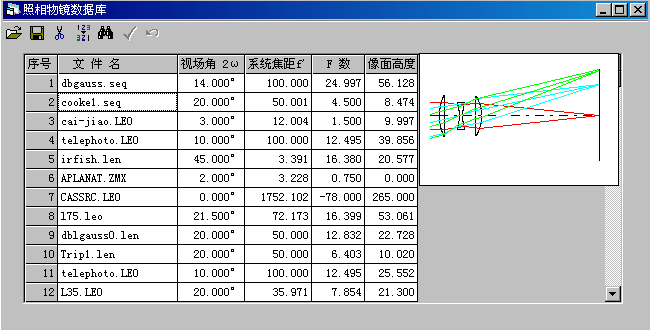 軟件包在文件菜單里為用戶提供了一個(gè)典型鏡頭資料庫功能,此鏡頭庫是一個(gè)開放式鏡頭資料庫,不僅收入了國內(nèi)外如CODE Ⅴ、Zemax、OSLO等光學(xué)軟件中所列各種專利鏡頭數(shù)據(jù)及其他專利鏡頭資料2500多,供設(shè)計(jì)選取和參考。還可及時(shí)記錄和存入用戶積累的光學(xué)數(shù)據(jù)資料。