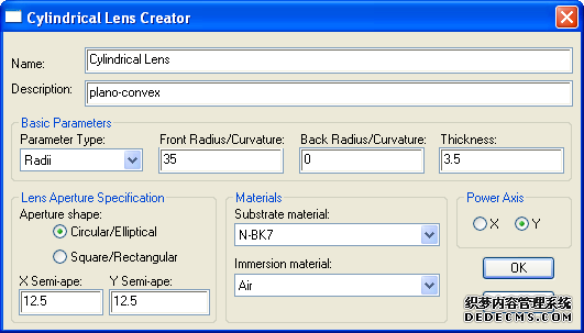 目前,F(xiàn)RED尚未包括內(nèi)嵌的柱透鏡生成器,柱透鏡需要人工逐個(gè)表面進(jìn)行創(chuàng)建,或在柱透鏡元件目錄里添加并進(jìn)行相應(yīng)的參數(shù)調(diào)整。該文檔演示創(chuàng)建柱透鏡的腳本,在基本對(duì)話框中(下圖示)由用戶進(jìn)行定義。利用這種透鏡定義方式,可同樣的用于其它軸對(duì)稱透鏡的創(chuàng)建。